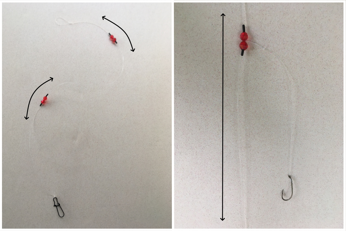 This is the only mono fishing rig we make and it's adjustable like our wire rigs. Use with any size leaders and still no tangles. Attach your hook leader between the double red beads. Position red beads to match your hook's leader lengths and prevent double hook tangles.